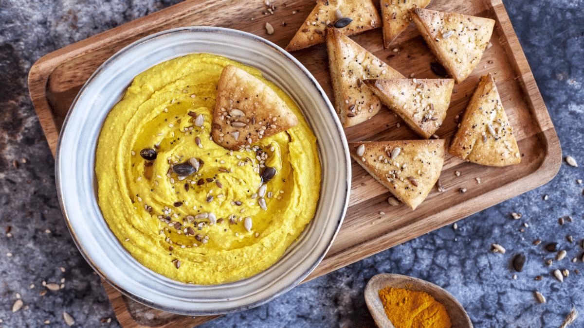 Sirve el hummus en un bowl bajo, rocía con aceite de oliva y cúrcuma, y acompaña con los chips de arroz en abanico o en vaso tipo “snack elegante”.